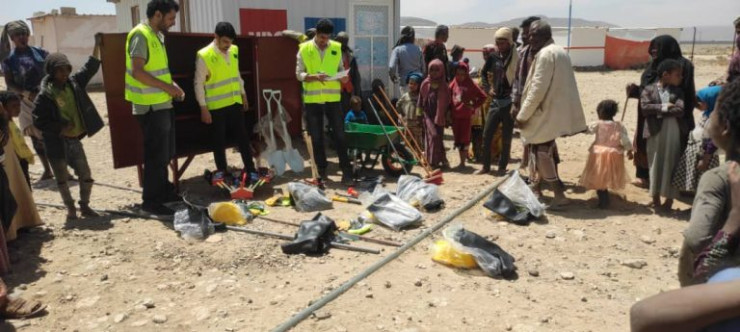 تم توزيع صناديق الصيانة في 7 مواقع للنازحين في محافظتي عمران وصنعاء. في كل صندوق (اداوات السباكة وأدوات صيانة المأوى ومستلزمات السلامة).