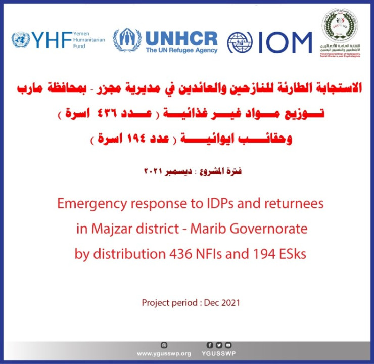 الاستجابة الطارئة للنازحين والعائدين في مديرية مجزر – بمحافظة مارب تـــوزيع مـــواد غيـــر غذائيـــة ( عـــدد 436 اسرة ) وحقائــــب ايوائيـــــة ( عدد 194 اسرة ) تنفيذ المشروع : منظمة الاخصائيين الاجتماعيين والنفسيين اليمنيين (YGUSSWP)تمويل: IOM – UNHCR – YHF المناطق المستهدفة: محافظة مارب – مديرية مجزر الفترة الزمنية: ( ديسمبر 2021 )