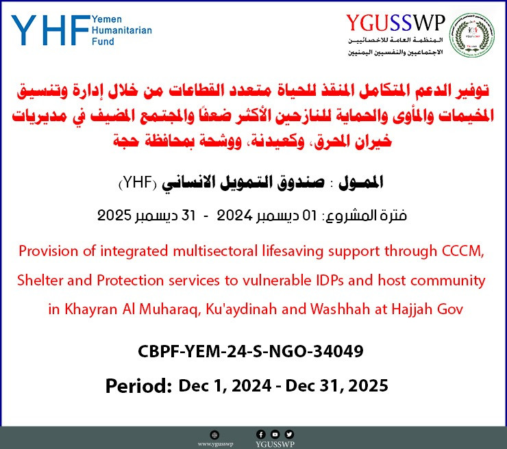 مشروع: توفير الدعم المتكامل المنقذ للحياة متعدد القطاعات من خلال إدارة وتنسيق المخيمات والمأوى والحماية للنازحين الأكثر ضعفاً والمجتمع المضيف في مديريات خيران المحرق، وكعيدنة، ووشحة بمحافظة حجة