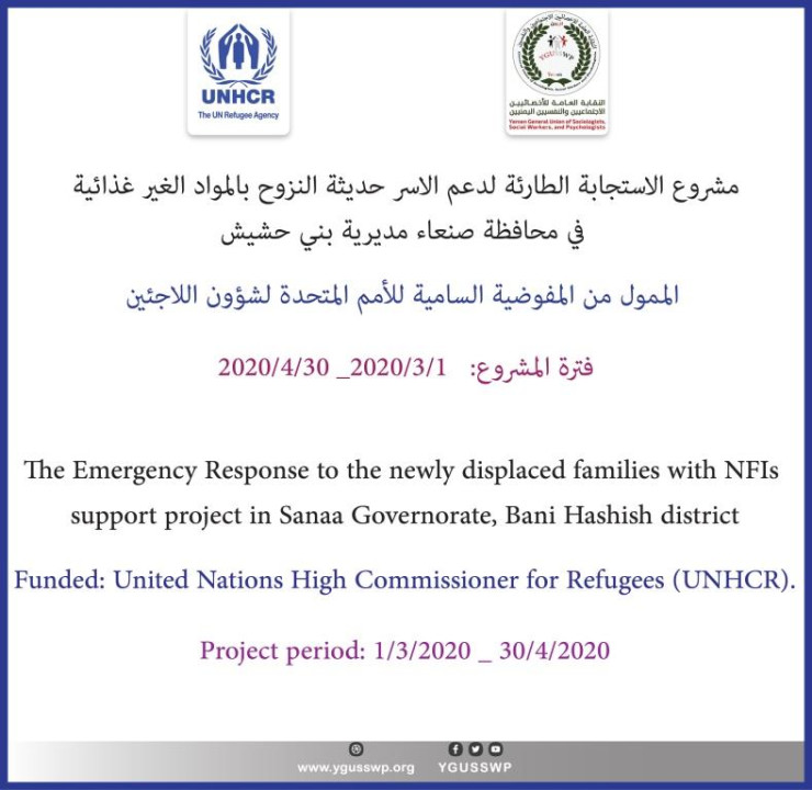 يشمل المشروع استجابة طارئة تهدف الى توفير الحماية اللازمة لحديثي النزوح بسبب الاحداث الاخيرة لسد احتياجاتهم من المواد الغير غذائية ومأوى الطوارئ من خلال توفير عدد (400) حقيبة مواد غير غذائية (NFIs) وعدد (40) حقيبة مأوى طارئ (ESKs) للنازحين القادمين من مديرية نهم ومارب الى مديرية بني حشيش محافظة صنعاء.