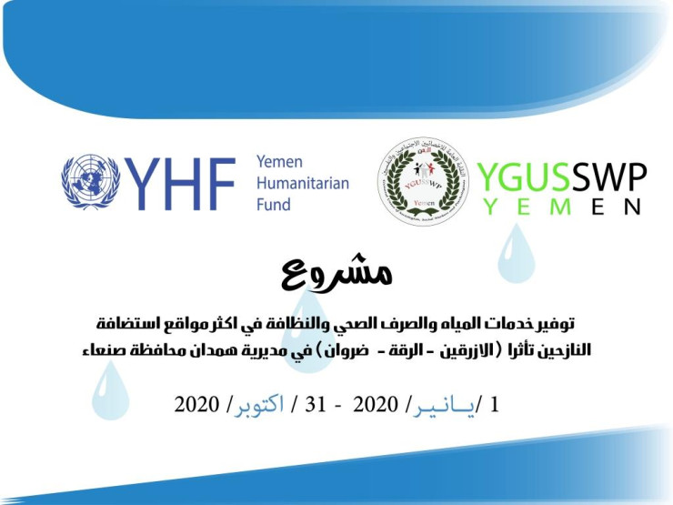 مشروع توفير خدمات المياه والصرف الصحي والنظافة في أكثر مواقع استضافة النازحين تأثراً (ضروان – الرقة – الازرقين) في مديرية همدان محافظة صنعاء التمويل: صندوق اليمن الانساني (YHF). المناطق المستهدفة: مديرية همدان عدد المستفيدين: (2301) فترة المشروع: 31/10/2020 _ 1/1/2020 هدف المشروع تزويد عدد (2301) من الاشخاص النازحين بالمياه “الأمانة” النظيفة وخدمات الصرف الصحي والنظافة في مخيمات النازحين (الازرقين، ضروان، الرقة، السواد) في مديرية همدان.