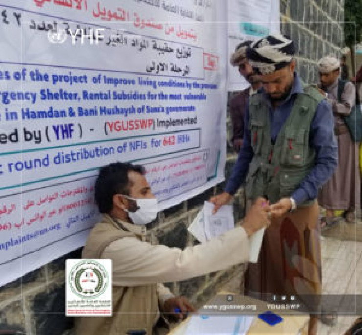 في اطار مشروع ” تحسين الظروف المعيشية من خلال توفير المواد الغير غذائية ومأوى الطوارئ وإعانات الايجار للفئات الاشد ضعفا في مديريتي همدان وبني حشيش في صنعاء” تستمر YGUSSWP وبدعم من صندوق اليمن الانساني (YHF) بتنفيذ أنشطة التوزيع الخاصة بالمواد غير غذائية للنازحين ،